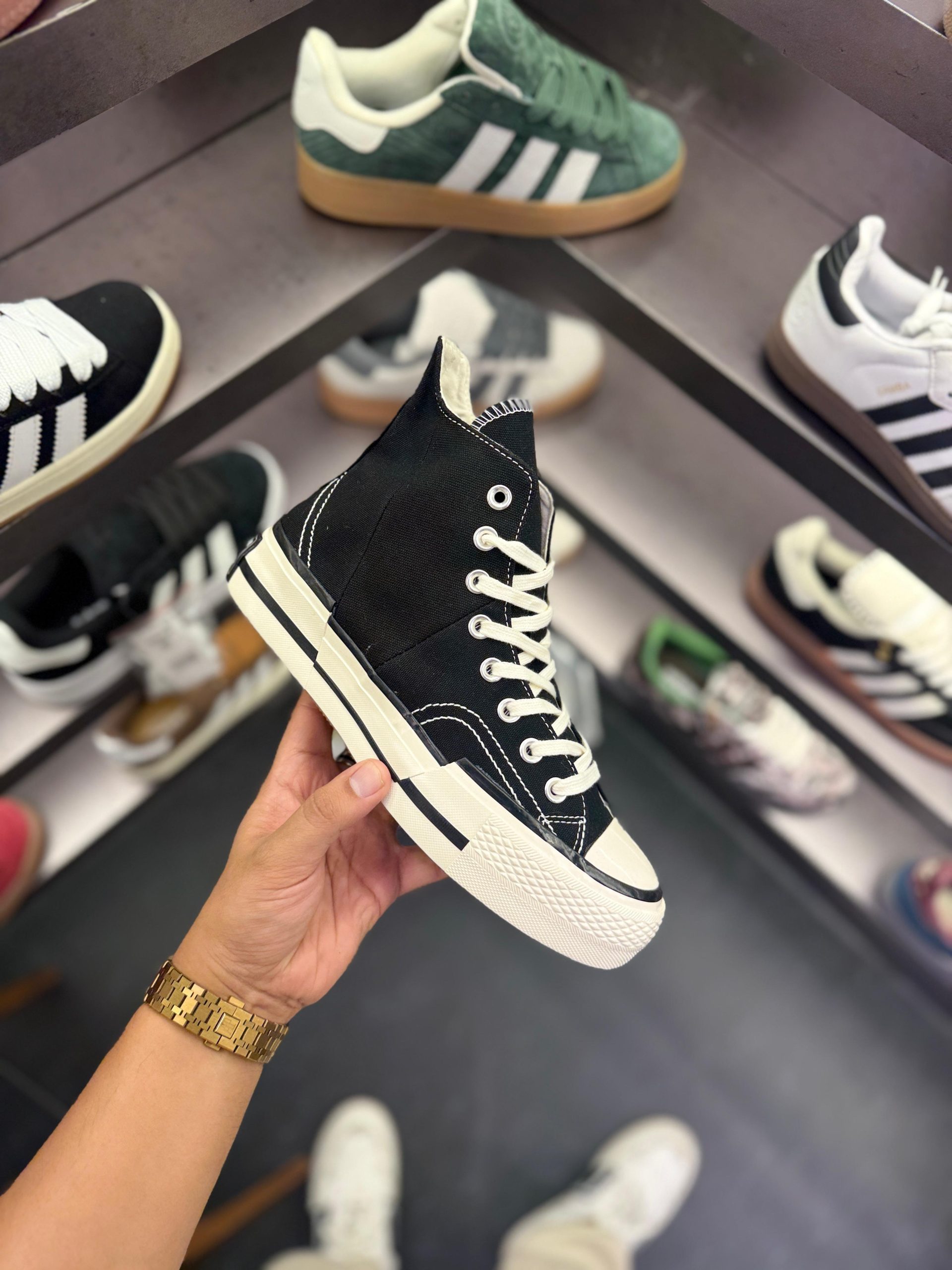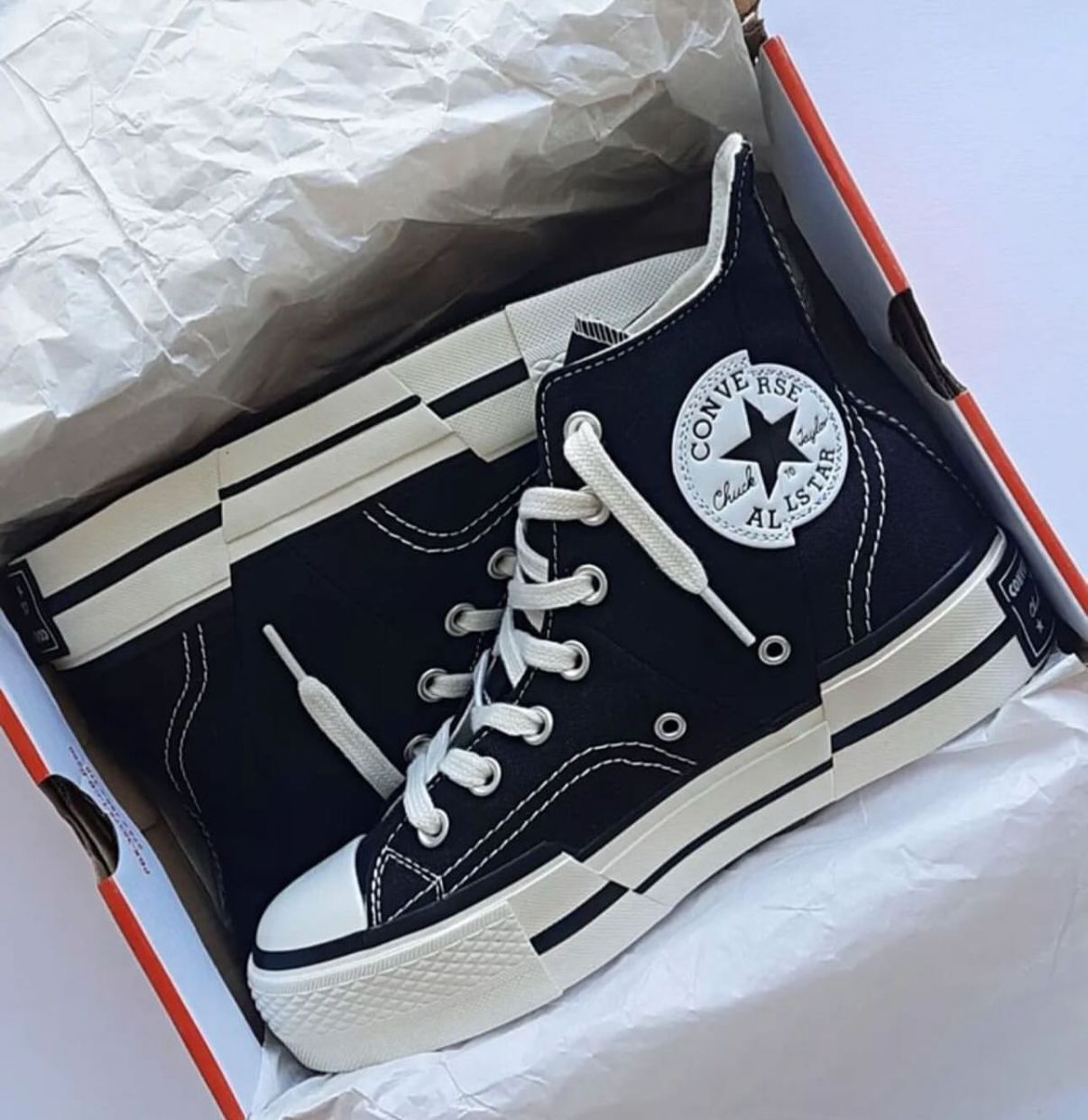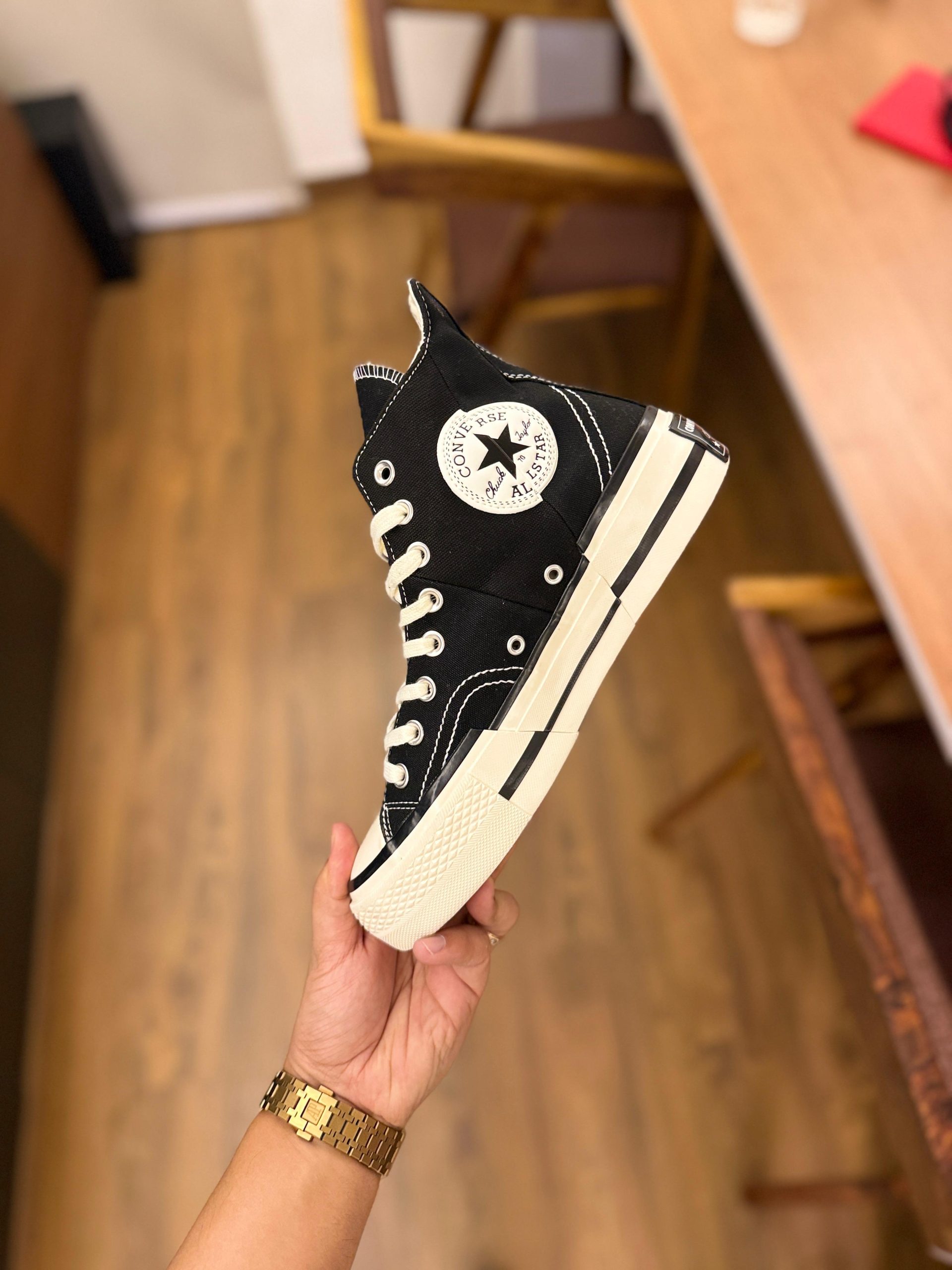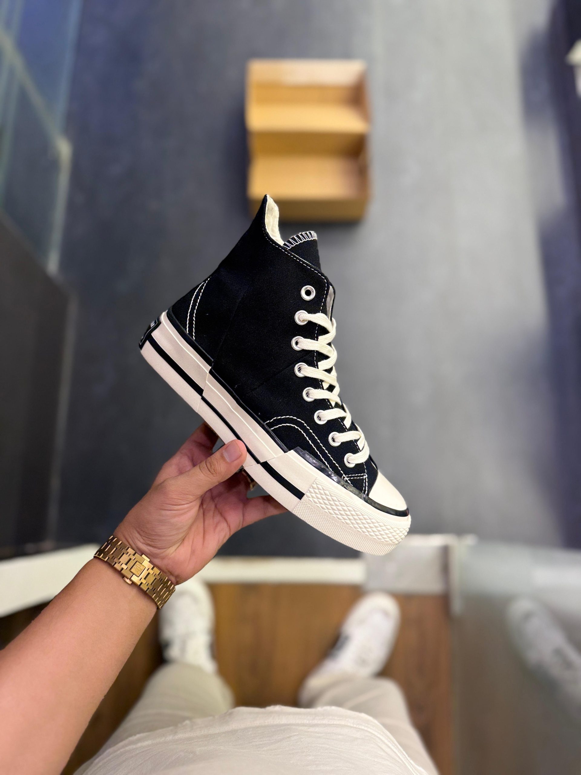 The black and white color combination adds versatility, allowing you to pair these shoes effortlessly with any outfit. The cushioned insole ensures comfort throughout the day, while the durable rubber outsole offers excellent grip and long-lasting wear. Whether you’re stepping out for a casual hangout or a weekend adventure, the First Copy Converse Chuck Mid Plus delivers both style and performance.