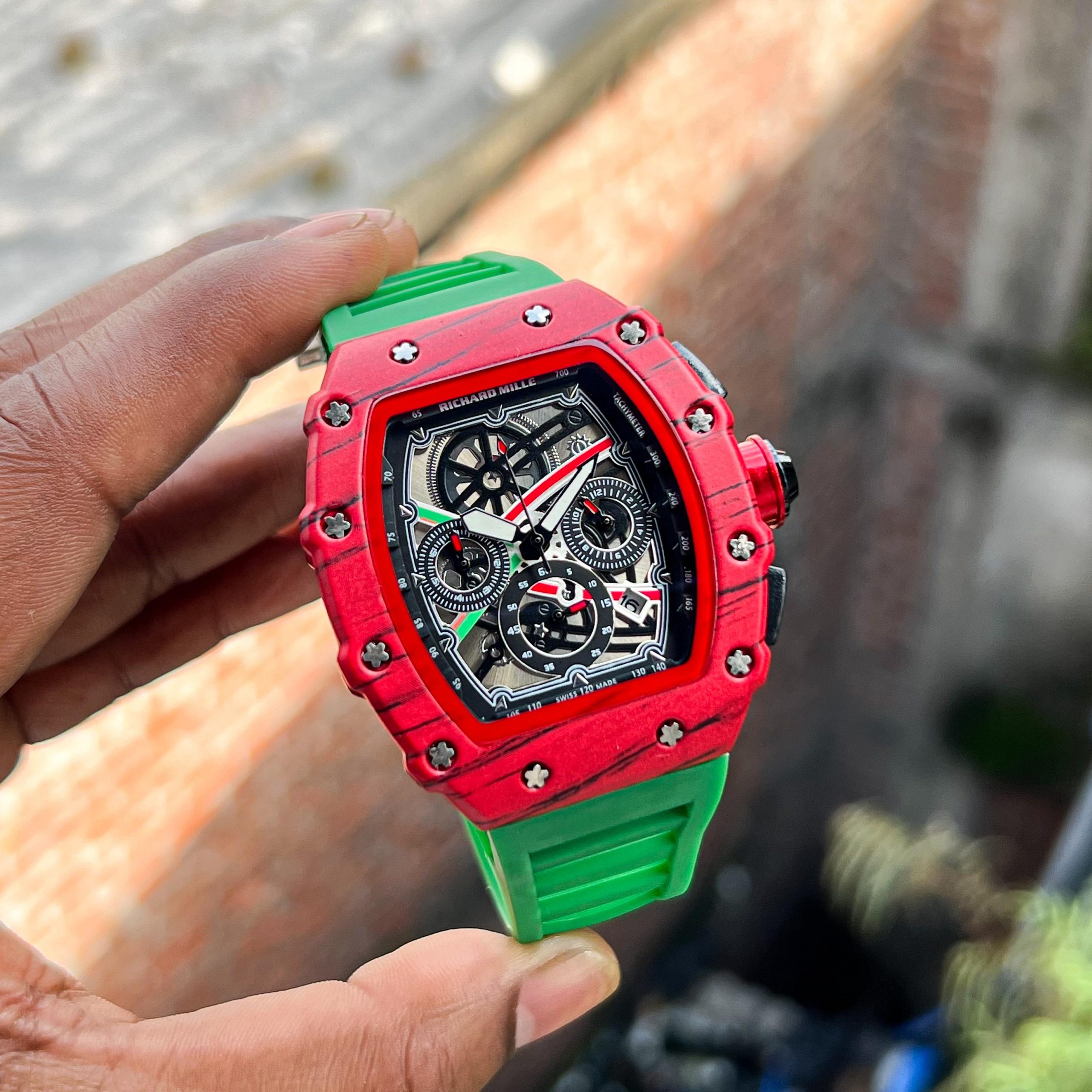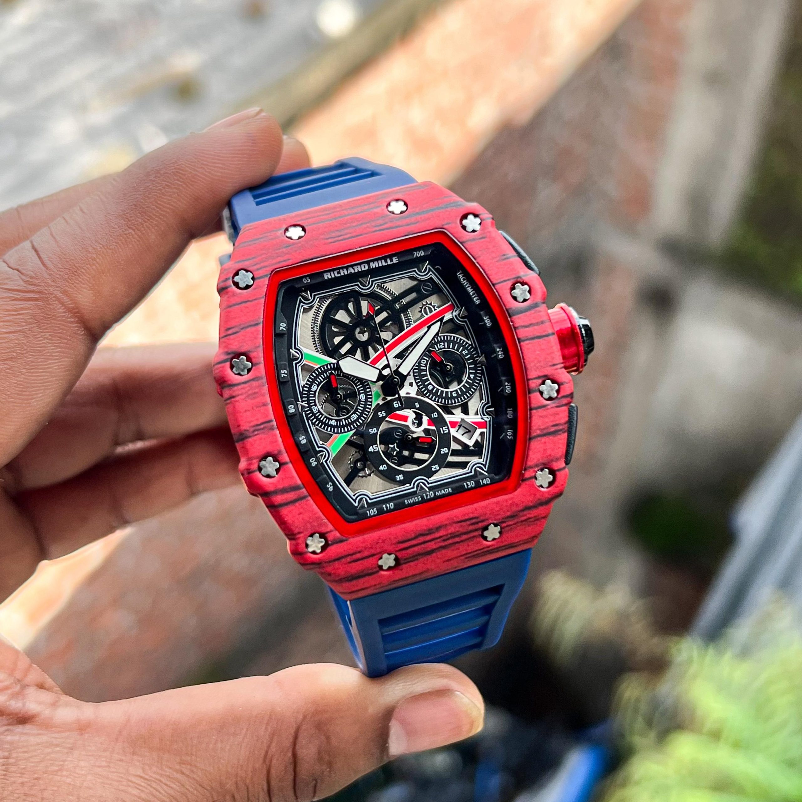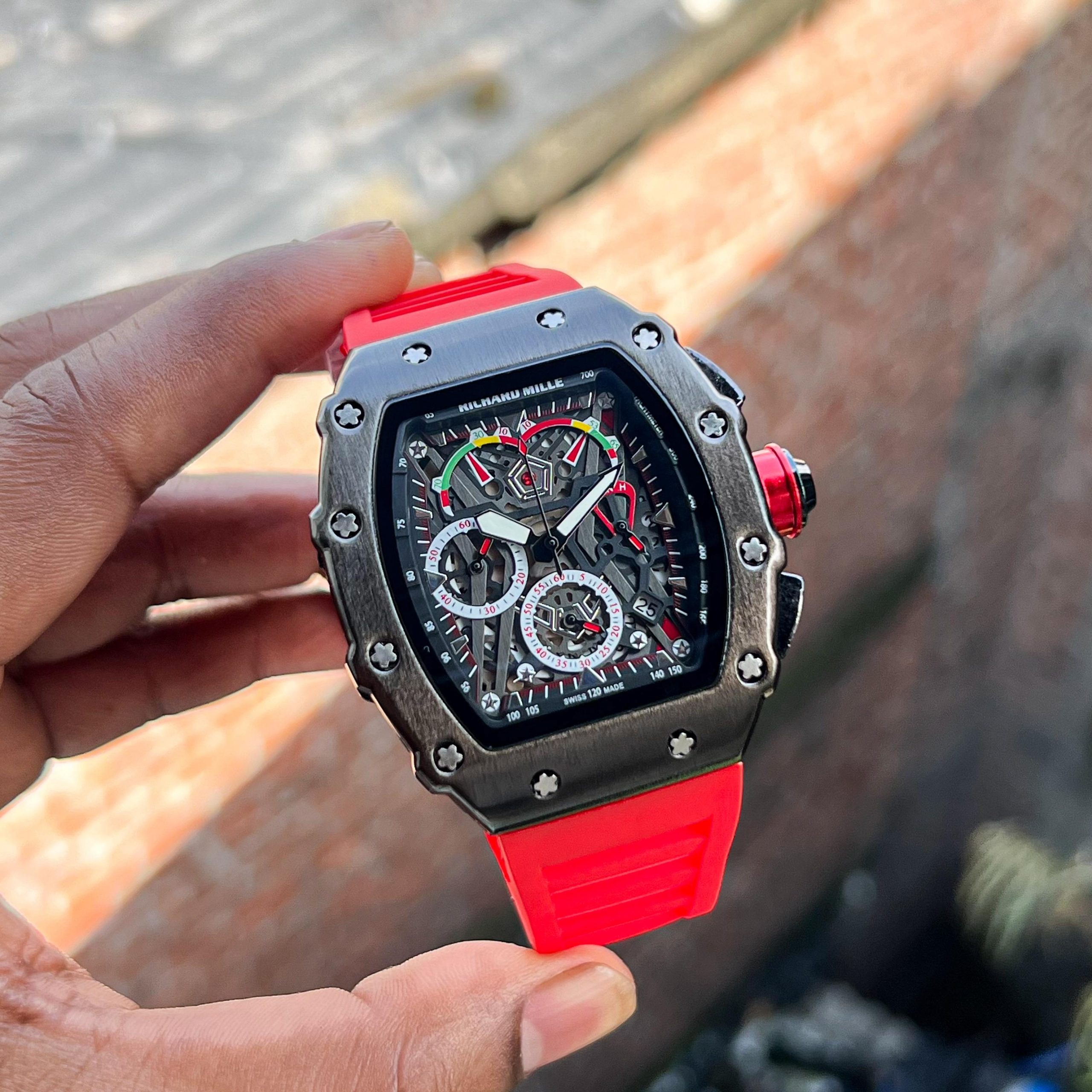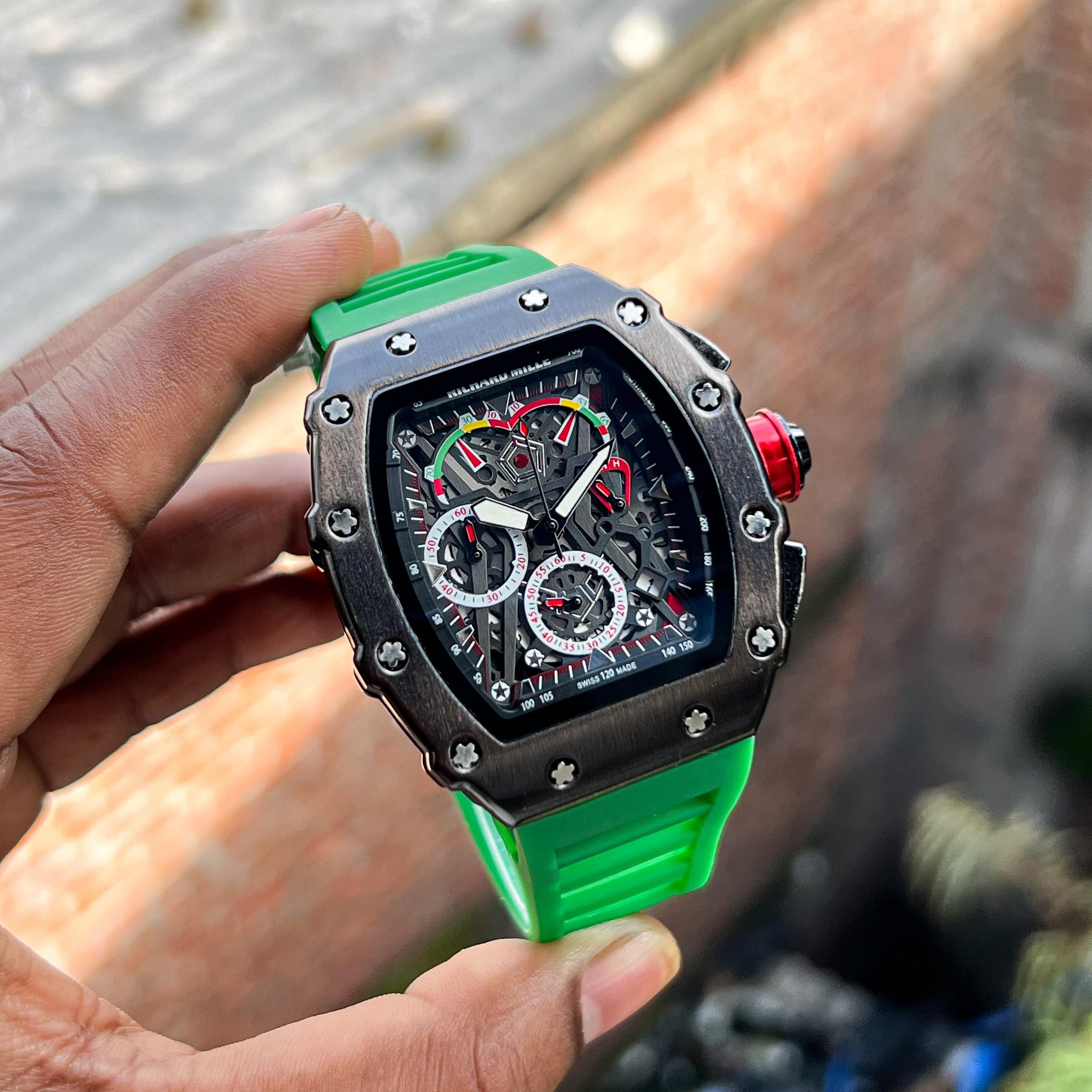 Luxury Richard Mille inspired wristwatch with a bold tonneau-shaped case, intricate skeleton dial showcasing multi-color