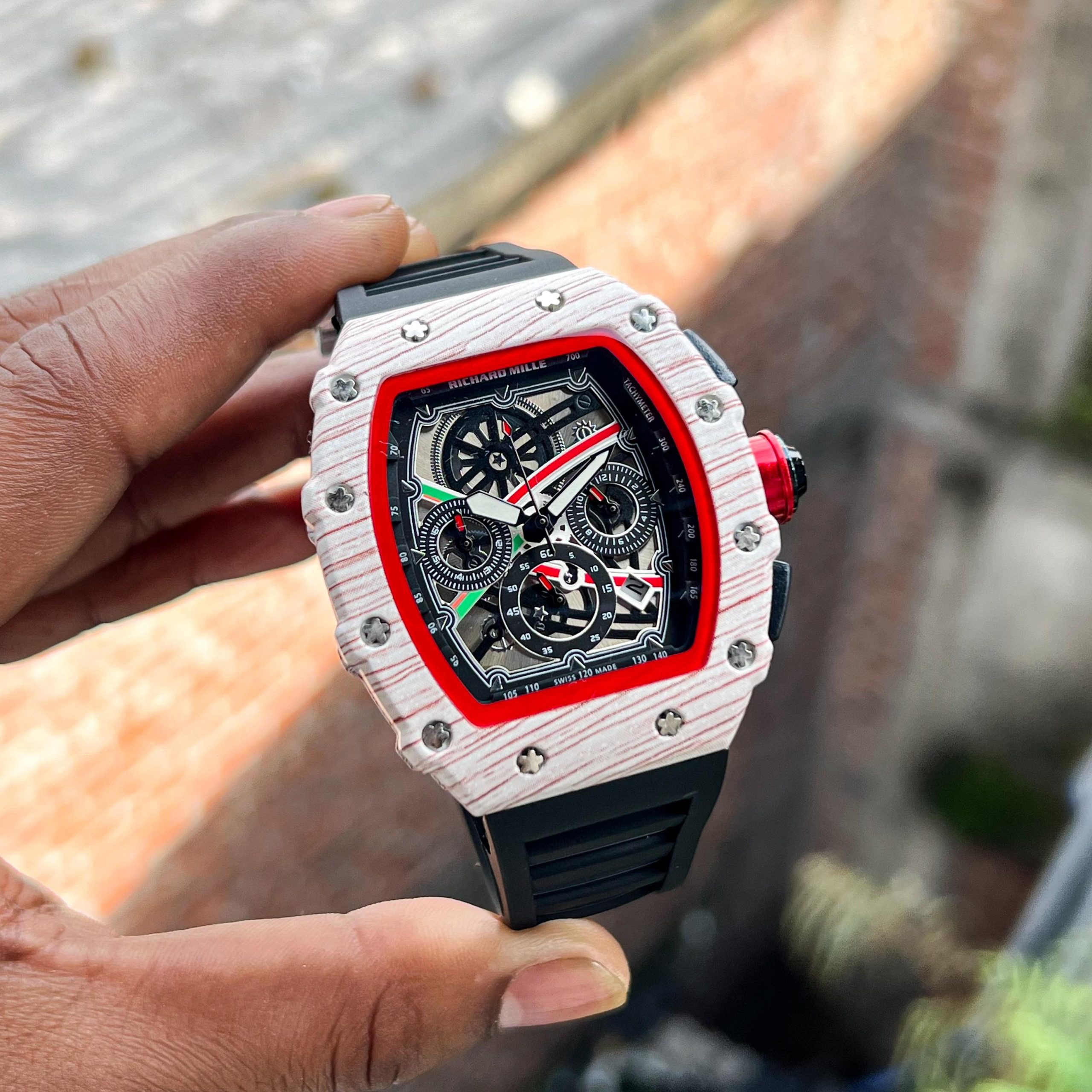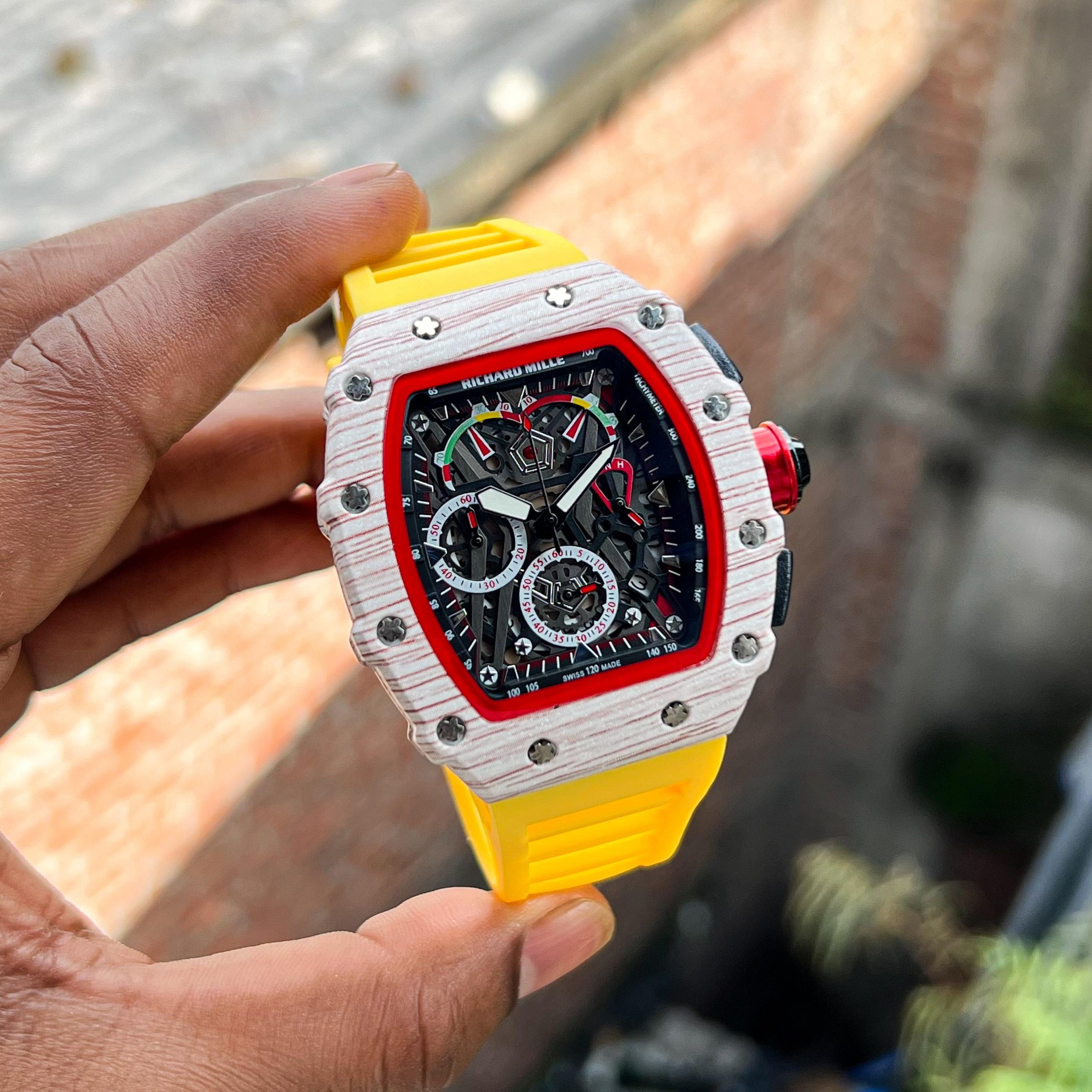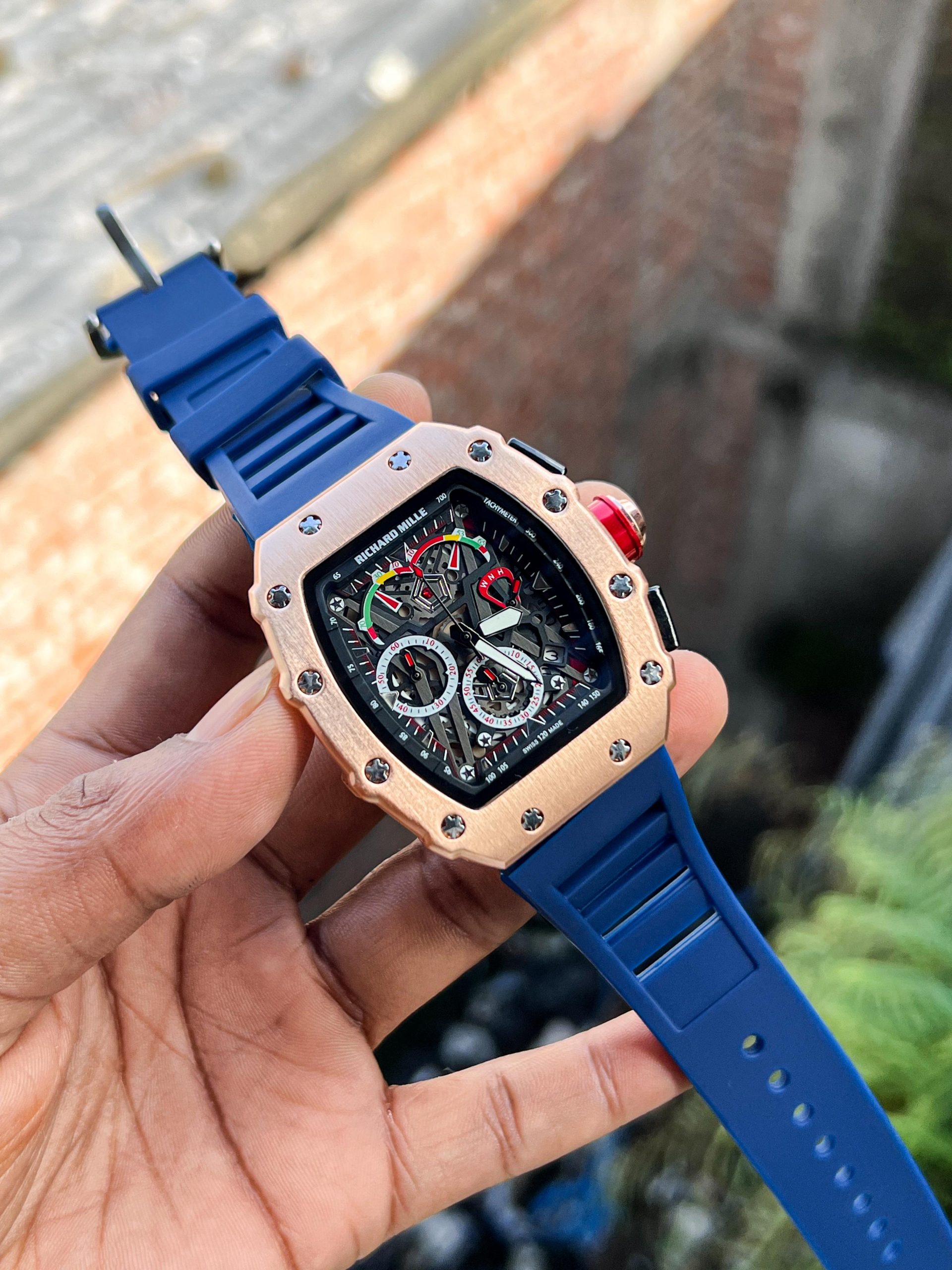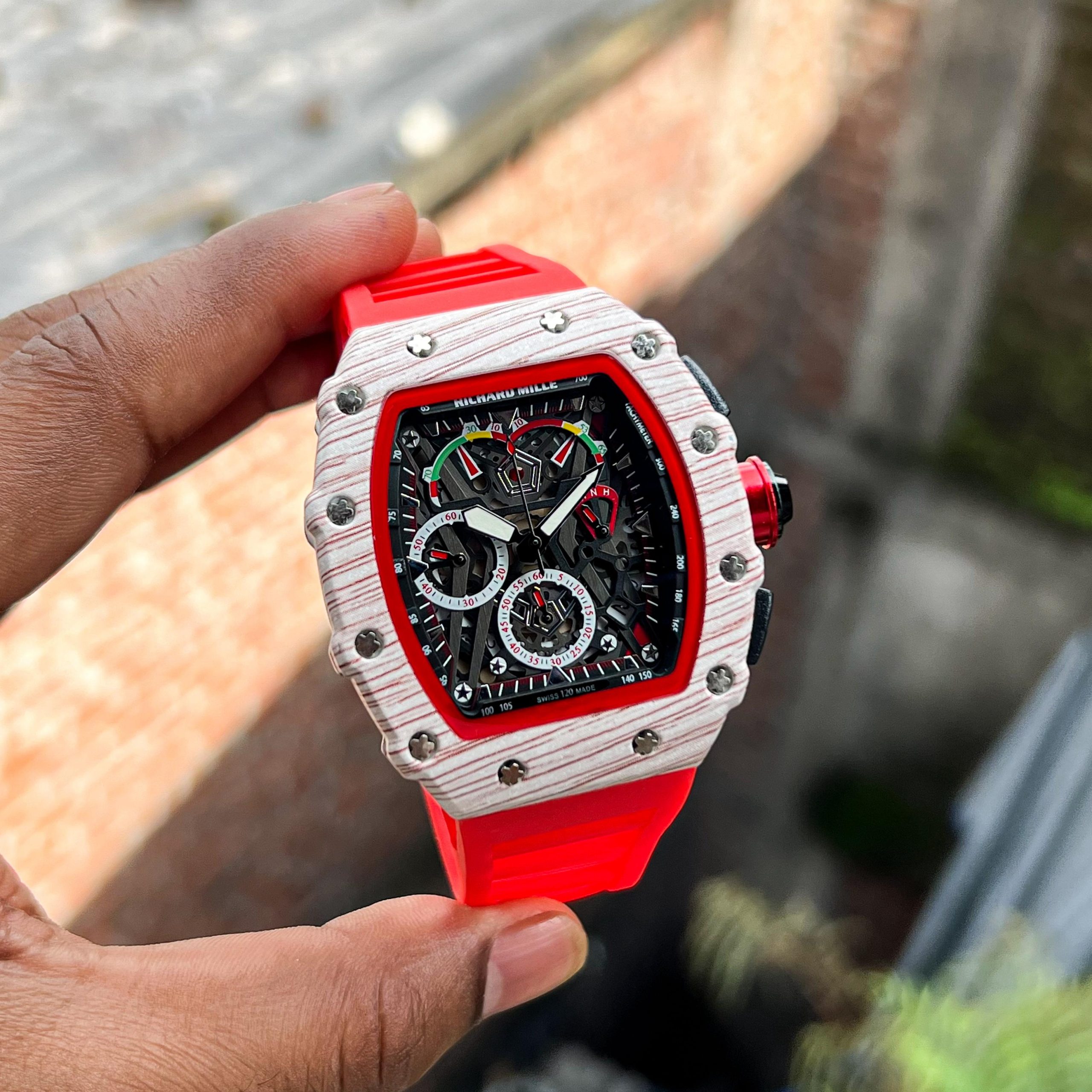 Luxury Richard Mille inspired wristwatch with a bold tonneau-shaped case, intricate skeleton dial showcasing multi-color